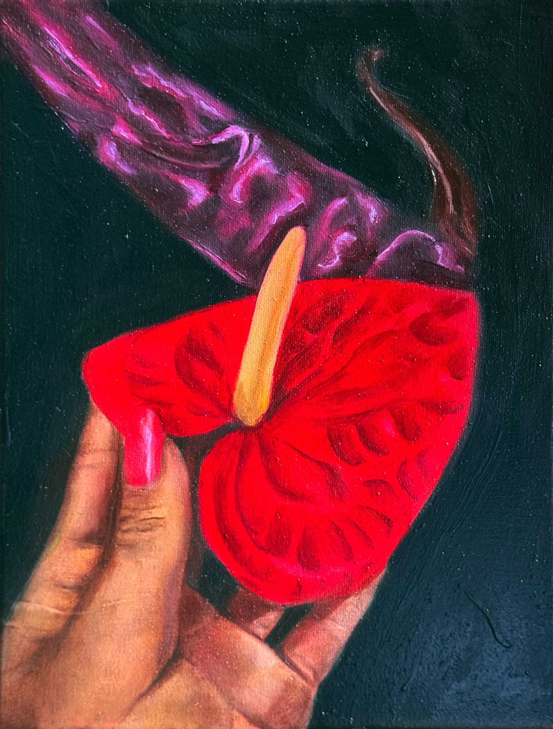 This piece explores the idea of my mexican heritage and cuisine symbolized with the chile guajillo, femininity and abundance. Anthuriums are an endemic flower species from the region where I was born.